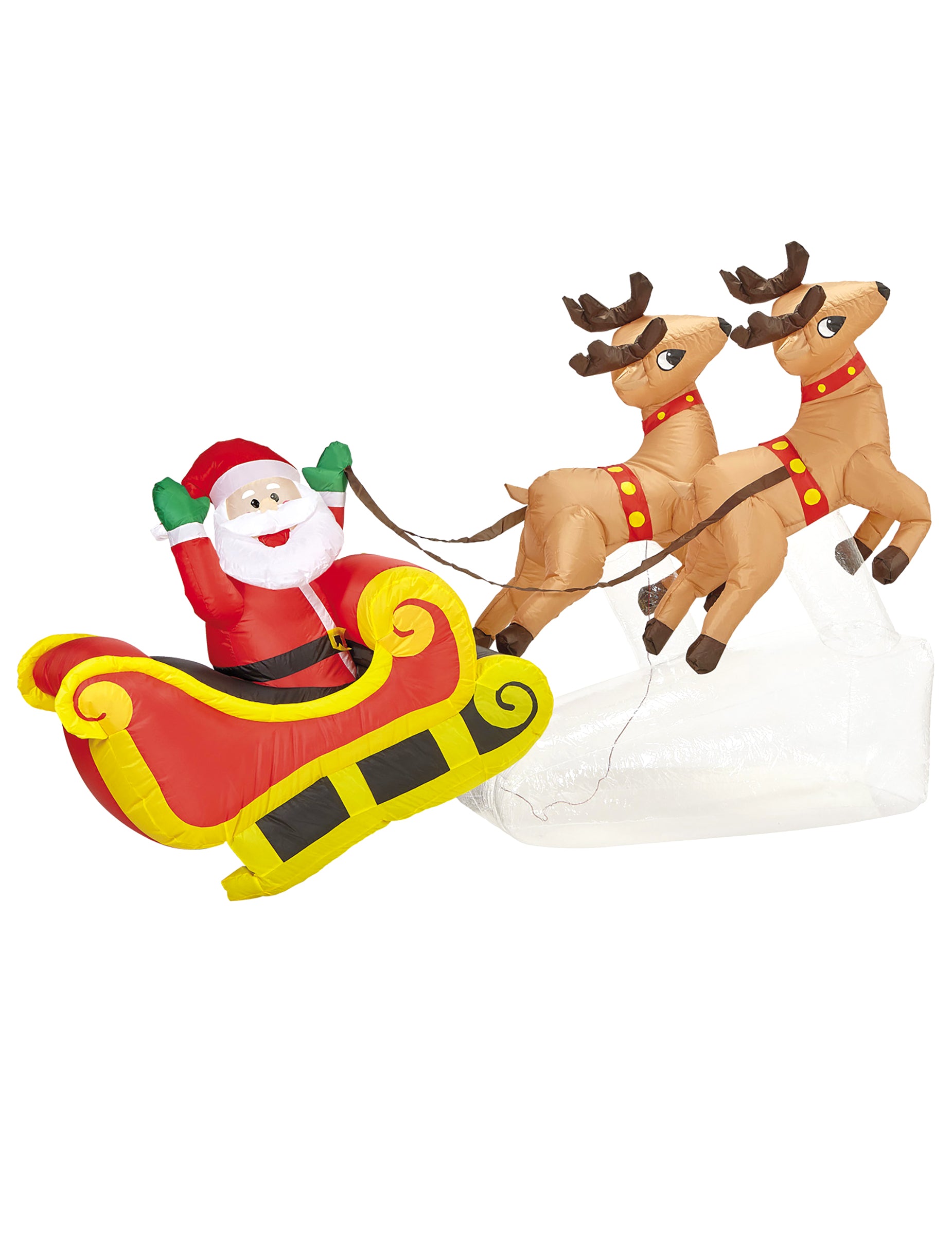 Toto velká nafukovací dekorace představujee Santa Claus instalovaný v jeho saních tažených dvěma soby, okamžitě přitahující pohledy, jakmile nastane noc.