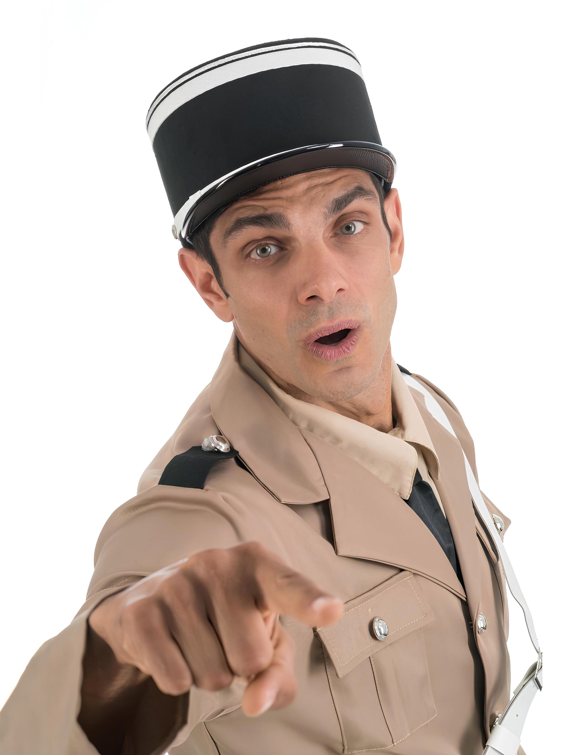 Její černý střední pruh je lemován bílými proužky, což jí dodává okamžitě rozpoznatelný vzhled. Pevný kšilt dotváří celkový dojem a dokonale doplňuje kostým četníka.