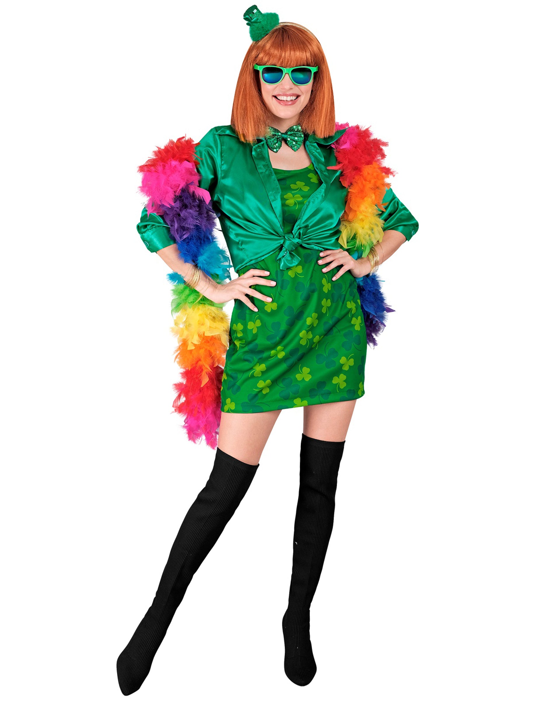 Tato krátká dámská šaty s motivem jetelů na Sv. Patrika přináší veselý nádech díky své jasně zelené barvě a vzorům jetele rozprostřeným po celém povrchu. Krátký střih zvýrazňuje postavu a zároveň nabízí jednoduchý a svěží styl, ideální pro oslavu tohoto ikonického svátku. Je lehká a příjemná na nošení, představuje tak perfektní kostým na večírek ve stylu Sv. Patrika nebo pro dodání slavnostního nádechu vašemu vzhledu.
