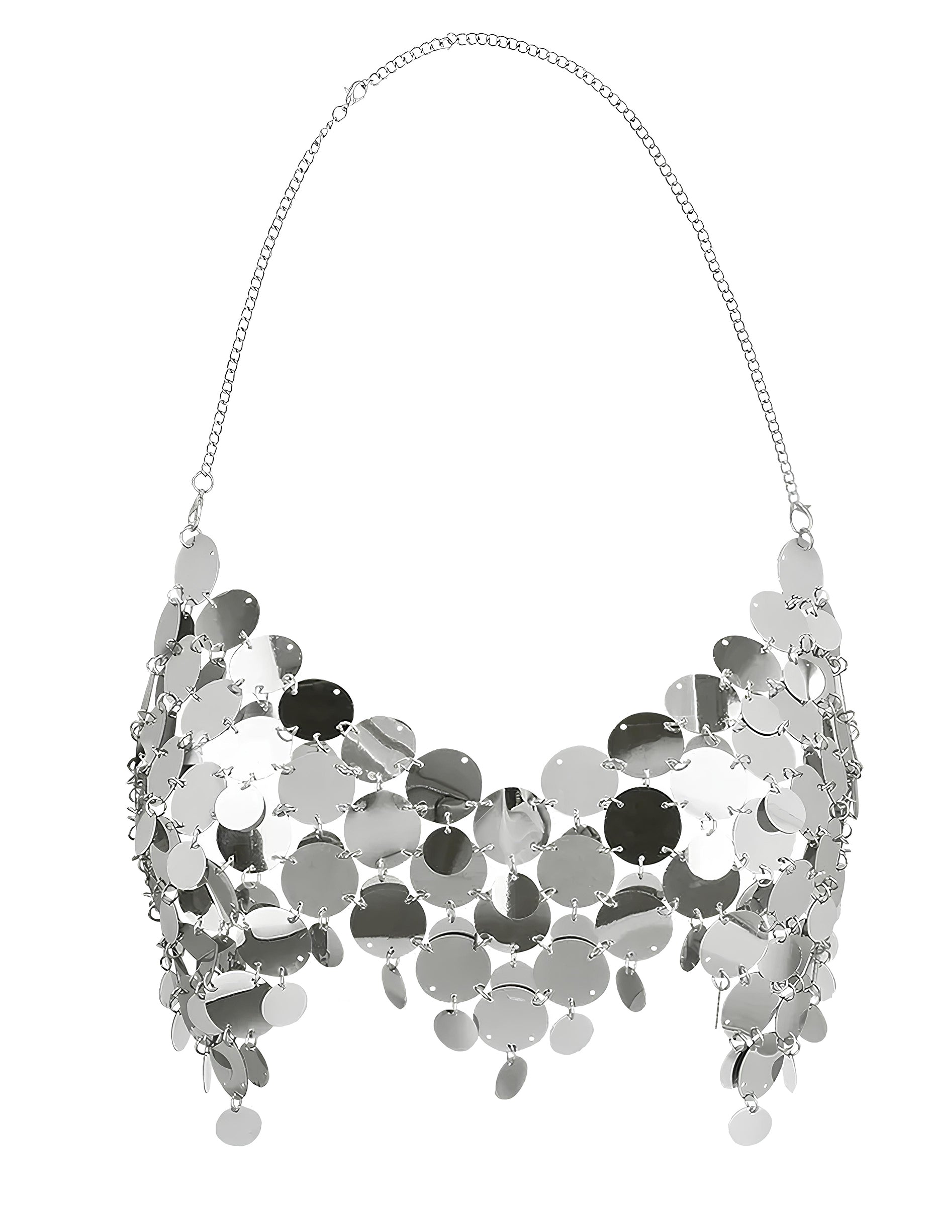 Tento dámský top s velkými stříbrnými flitry odhaluje lehký střih tvořený velkými metalickými flitry, které pokrývají trup a zároveň nechávají prosvítat pokožku pod nimi.