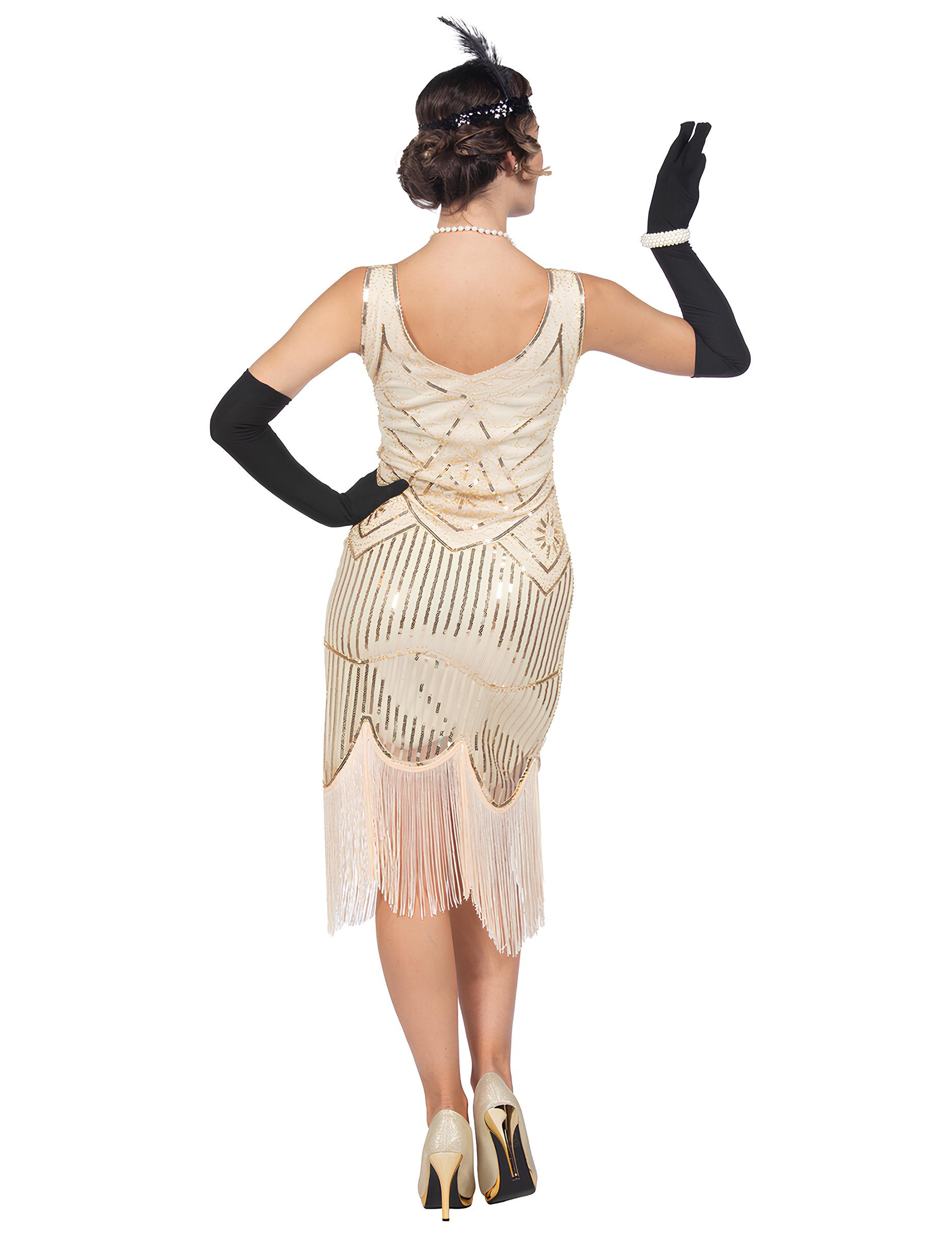 Tento luxusní béžový charlestonový dámský kostým se třpytivými flitry představuje šaty zdobené jemnými flitry tvořícími geometrické vzory, které připomínají typické oblečení bouřlivých dvacátých let. Béžový podklad dodává jemný nádech, který zvýrazňuje tyto lesklé detaily. Rovný střih je doplněn jemnými třásněmi ve spodní části šatů, což vytváří příjemný pohyb věrný charlestonovému stylu. Pravidelné vzory a jednoduché linie dodávají elegantní vzhled bez zbytečné okázalosti. Perfektní na večírek ve stylu 20. let, retro téma nebo elegantní akci, kde tyto šaty dodají vašemu kostýmu styl, eleganci a učiní váš outfit ještě příjemnějším, harmonickým a nezapomenutelným.