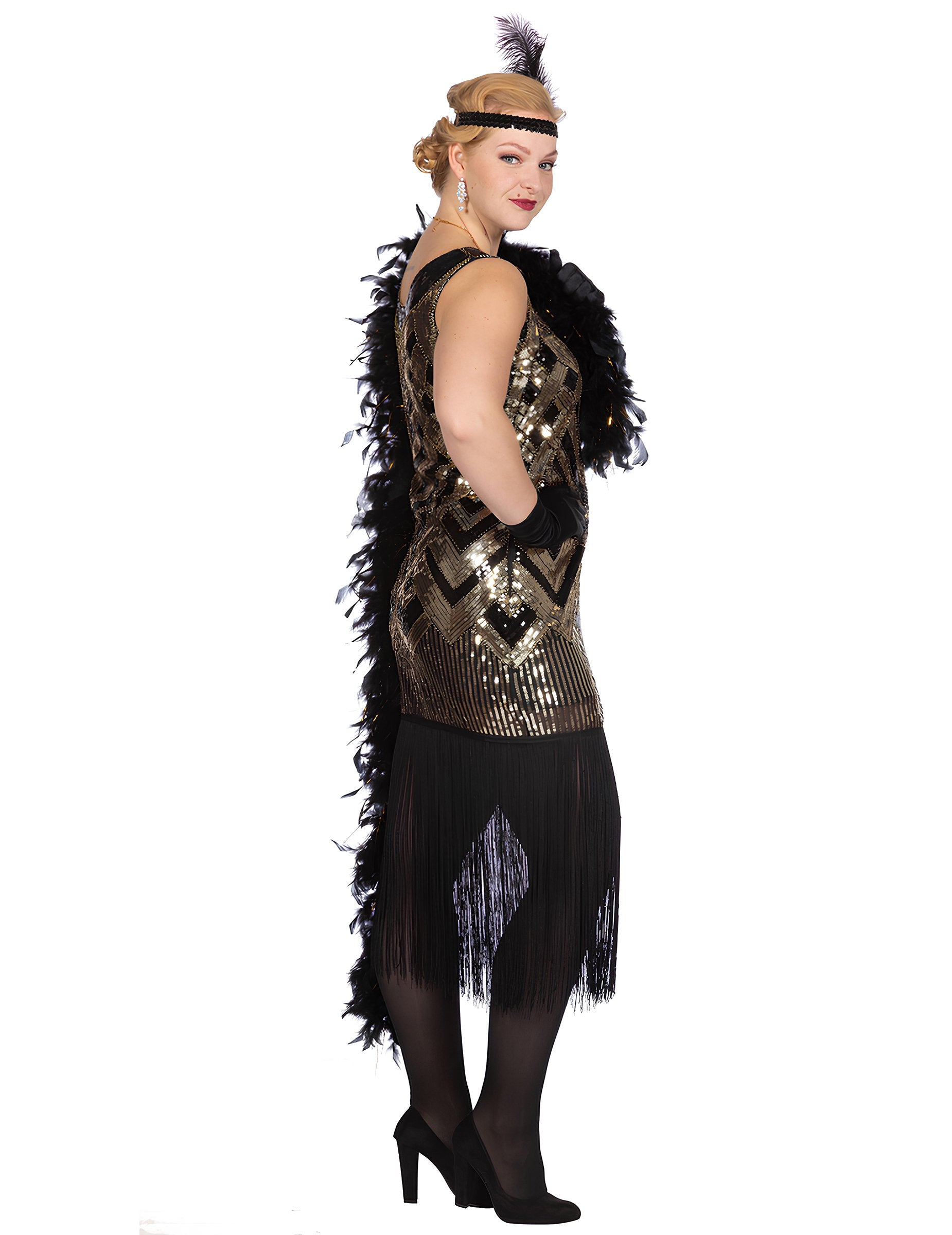 Tento luxusní dámský charlestonový kostým v černé a zlaté barvě se třpytkami zdůrazňuje šaty, jejichž kovové flitry vytvářejí grafické tvary, které přirozeně přitahují pohled. Kombinace černé a zlaté vytváří elegantní kontrast, který dodává outfitu opravdovou výraznost. Krátký střih nechává spadat dlouhé rovné třásně, které při každém kroku vytvářejí rytmický a plynulý pohyb ve stylu věrně odpovídajícím éře dvacátých let. Proměnlivé vzory, hustší v horní části a řidší směrem dolů, přinášejí příjemnou vizuální strukturu. Ideální na večírek ve stylu 20. let, retro ples nebo elegantní akci, kde tyto šaty podtrhnou výrazný styl a učiní váš vzhled ještě poutavějším, radostnějším a nezapomenutelným.