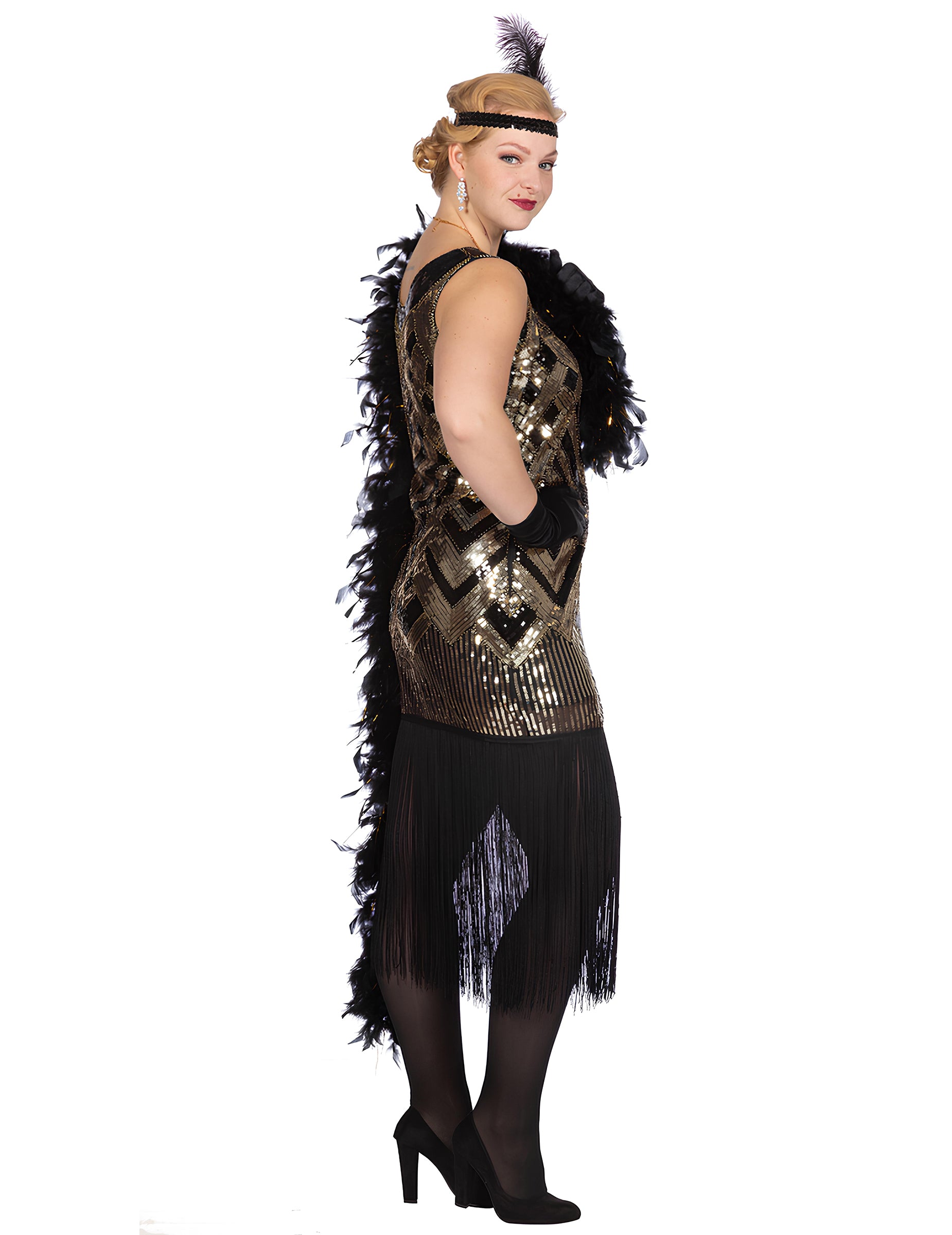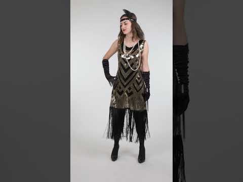 Tento luxusní dámský charlestonový kostým v černé a zlaté barvě se třpytivými flitry zdůrazňuje šaty, jejichž kovové flitry vytvářejí grafické vzory, které přirozeně přitahují pozornost. Kombinace černé a zlaté vytváří elegantní kontrast, který dodává outfitu skutečný šmrnc.