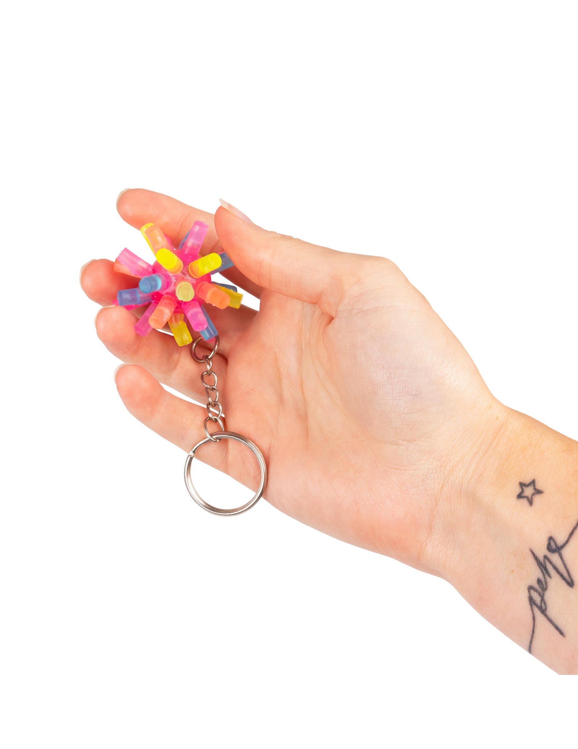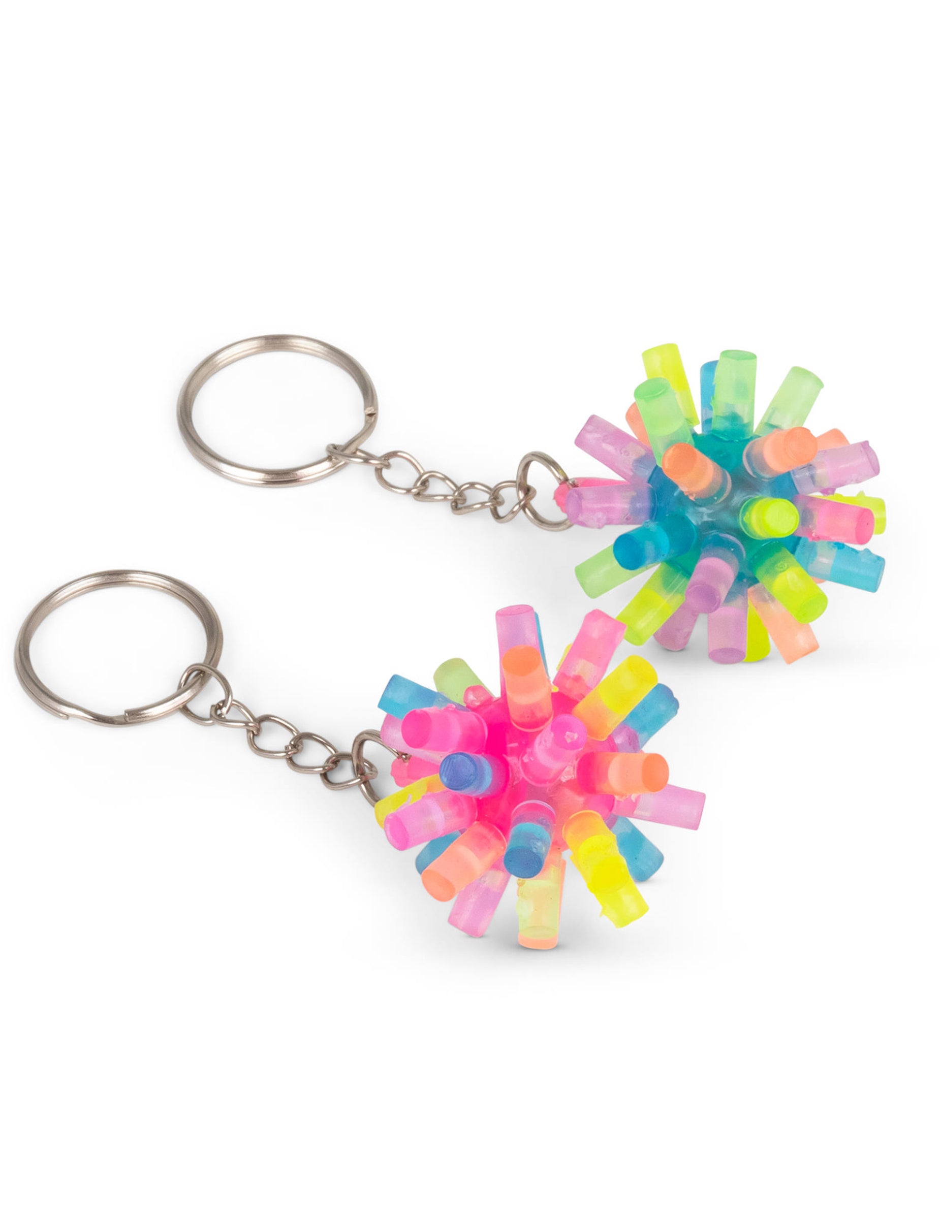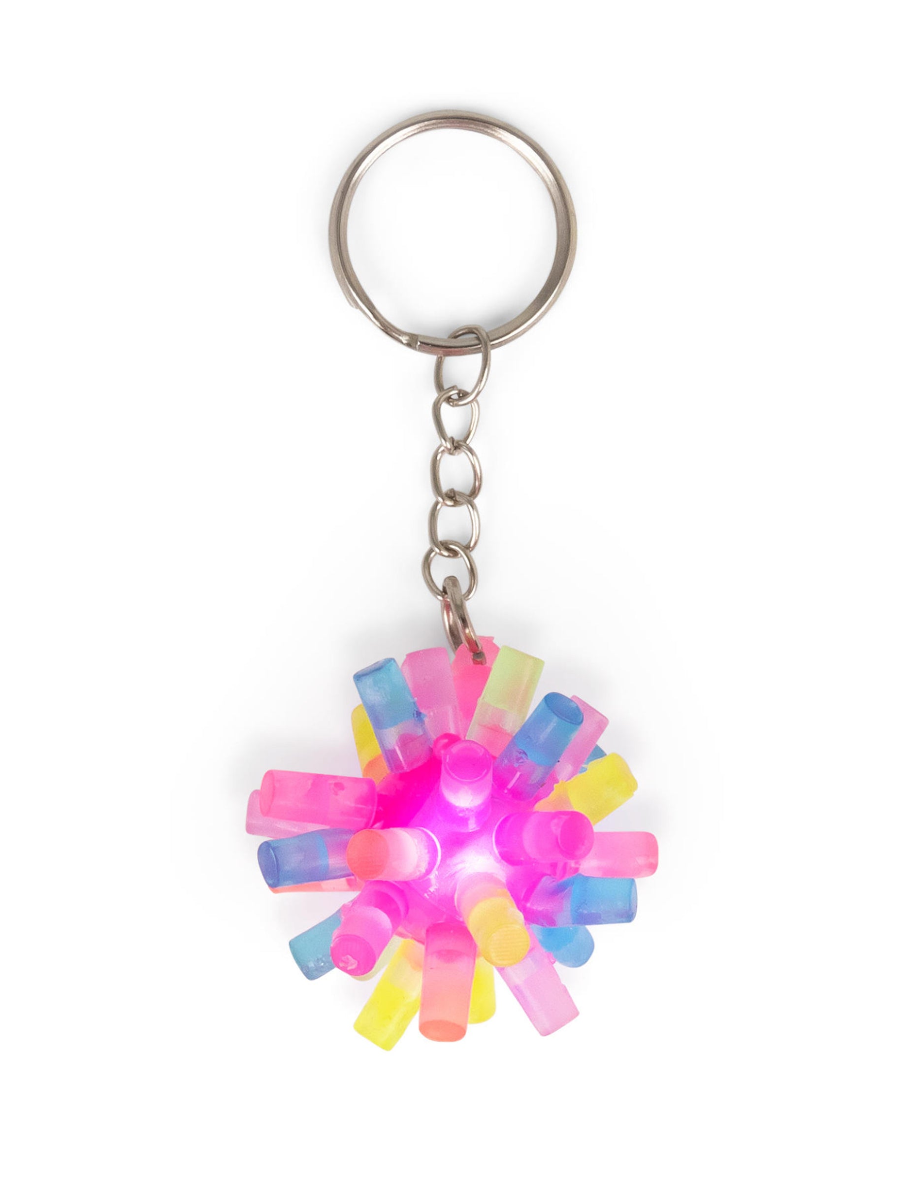 Míč má zaoblené tečky v různobarevných odstínech, které při aktivaci světla vytvářejí krásný efekt. Jeho měkká textura poskytuje příjemný úchop a kroužek na klíče se snadno zavěsí na tašku nebo klíčenku.