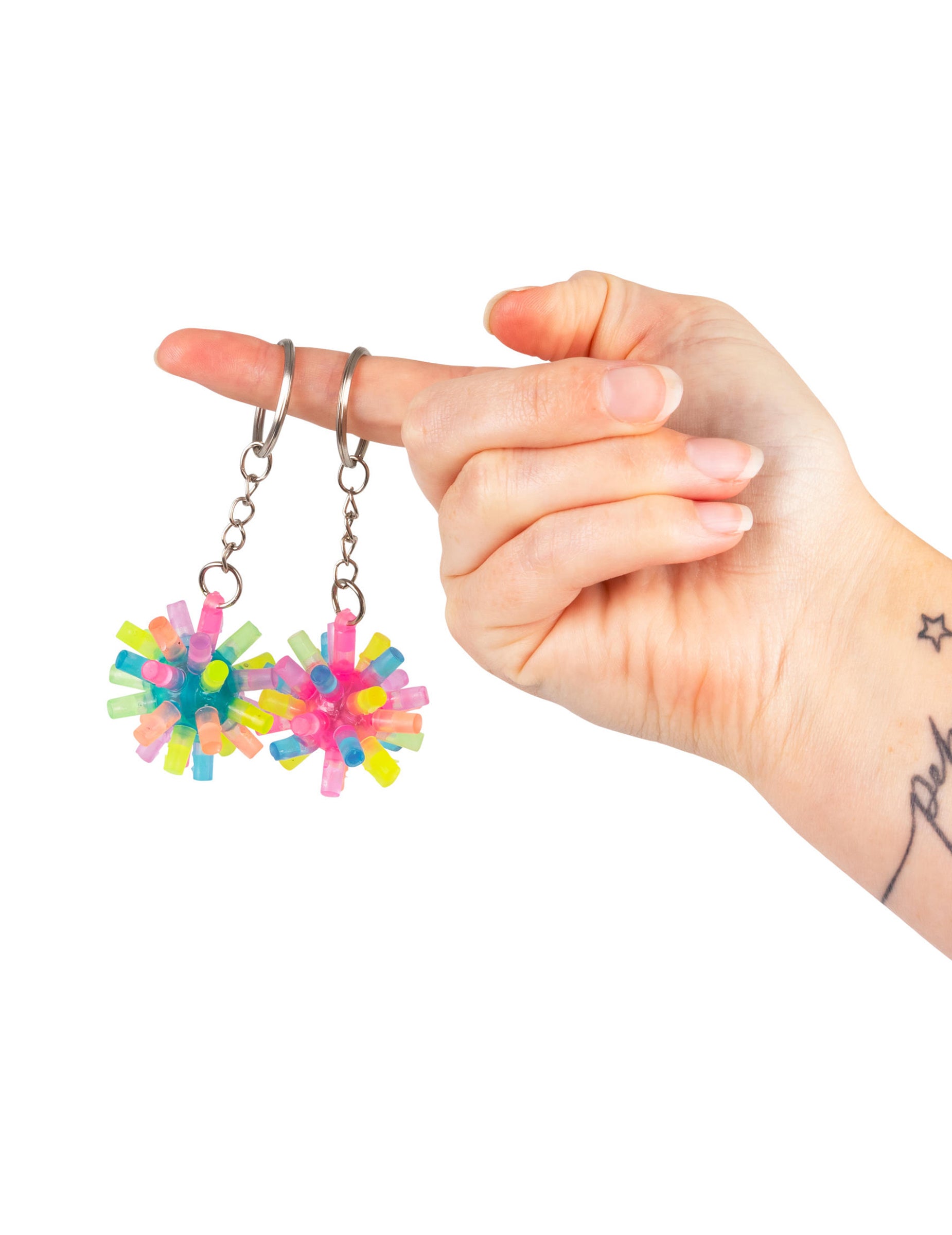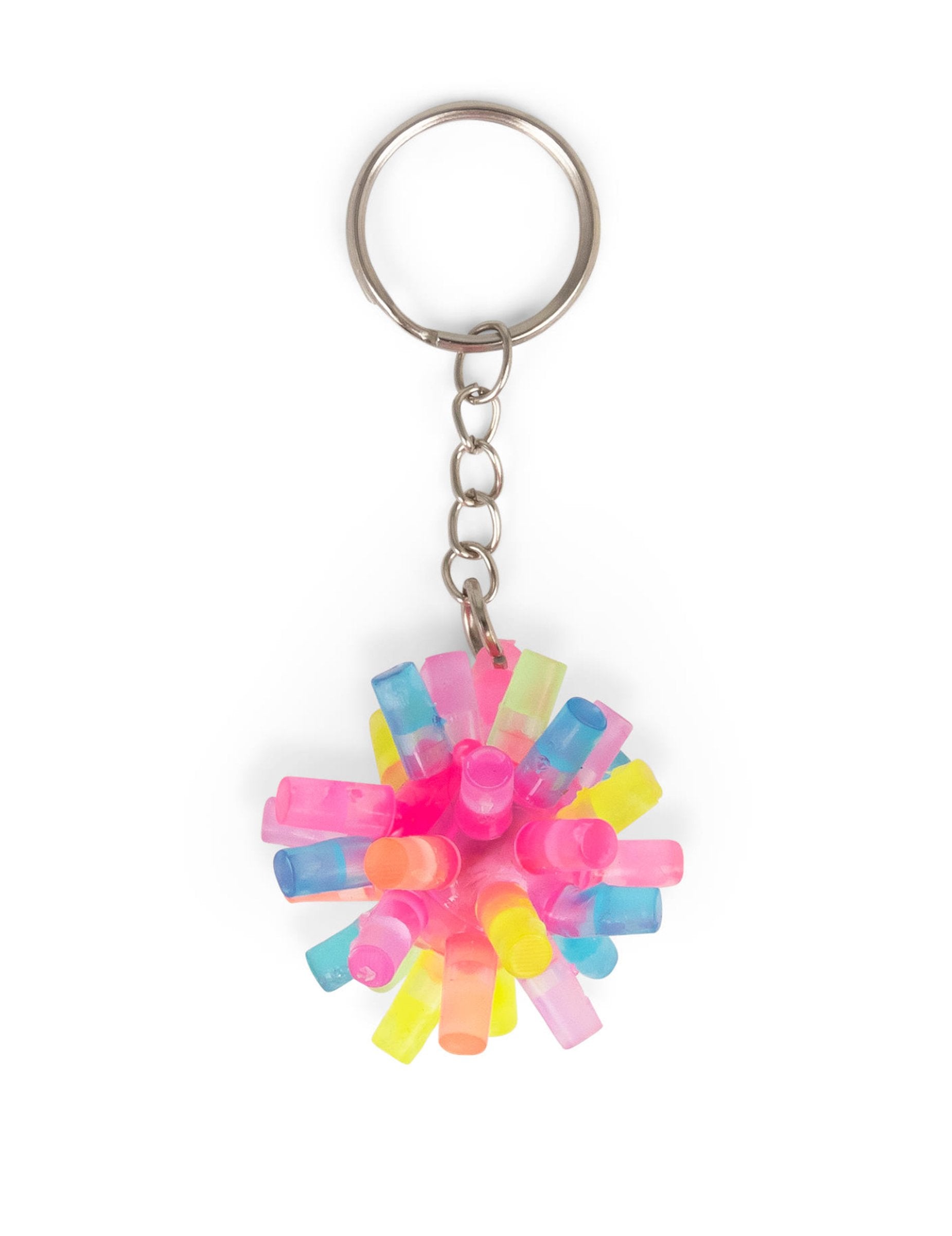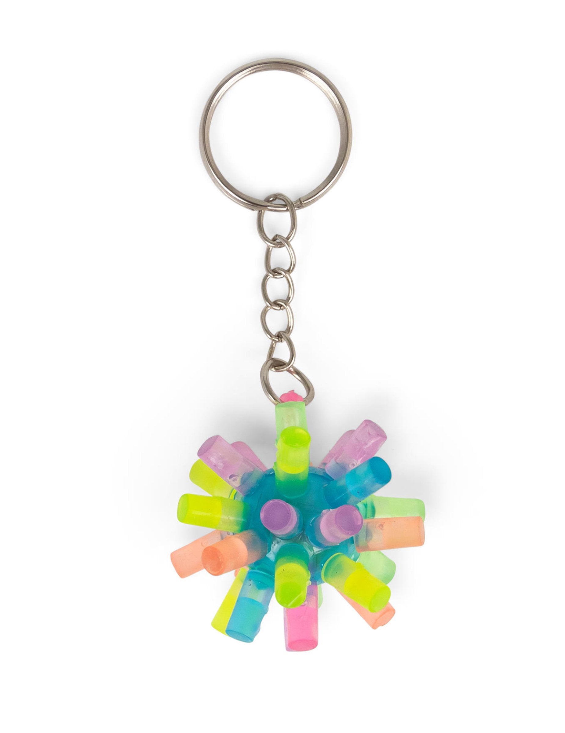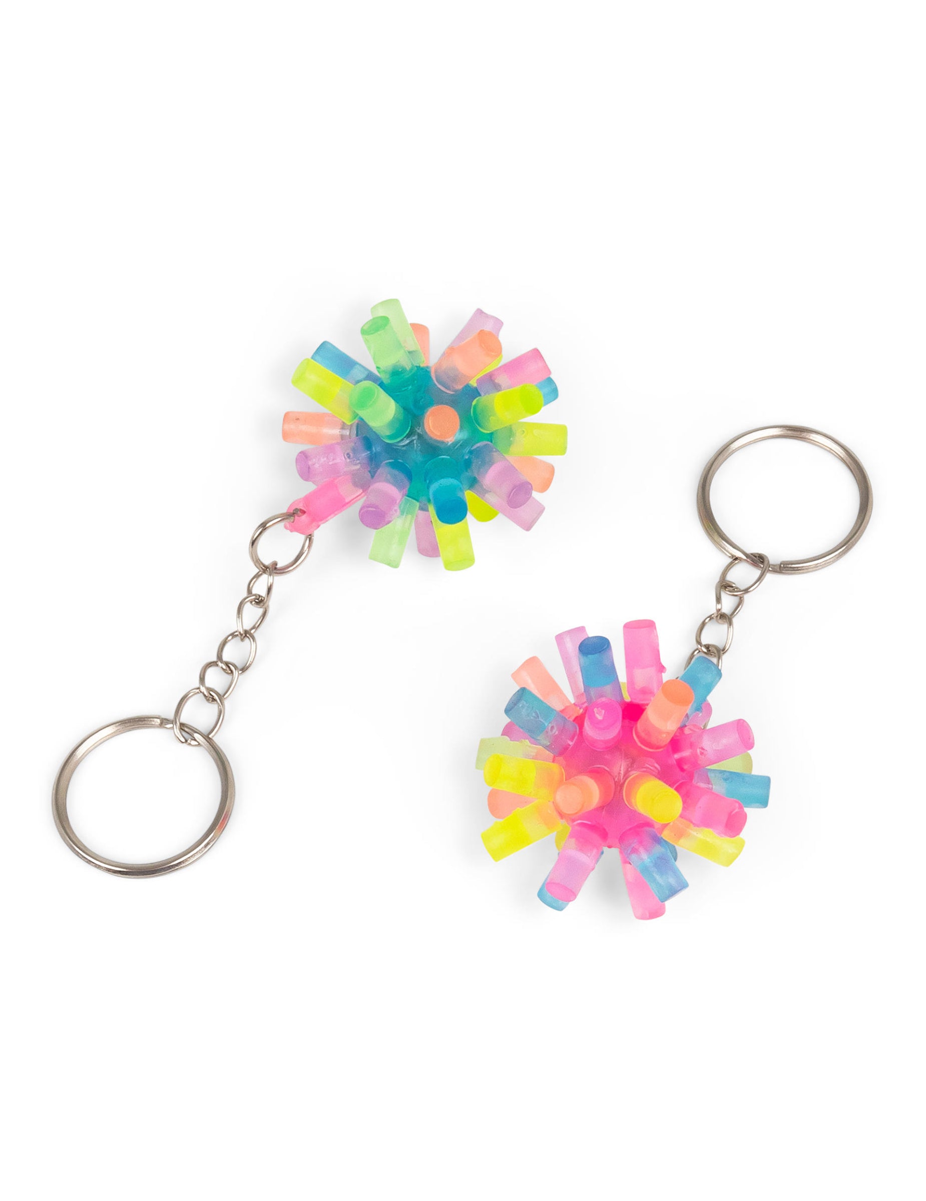 Míč má zaoblené tečky v různobarevných odstínech, které při aktivaci světla vytvářejí krásný efekt. Jeho měkká textura poskytuje příjemný úchop a kroužek na klíče se snadno zavěsí na tašku nebo klíčenku.