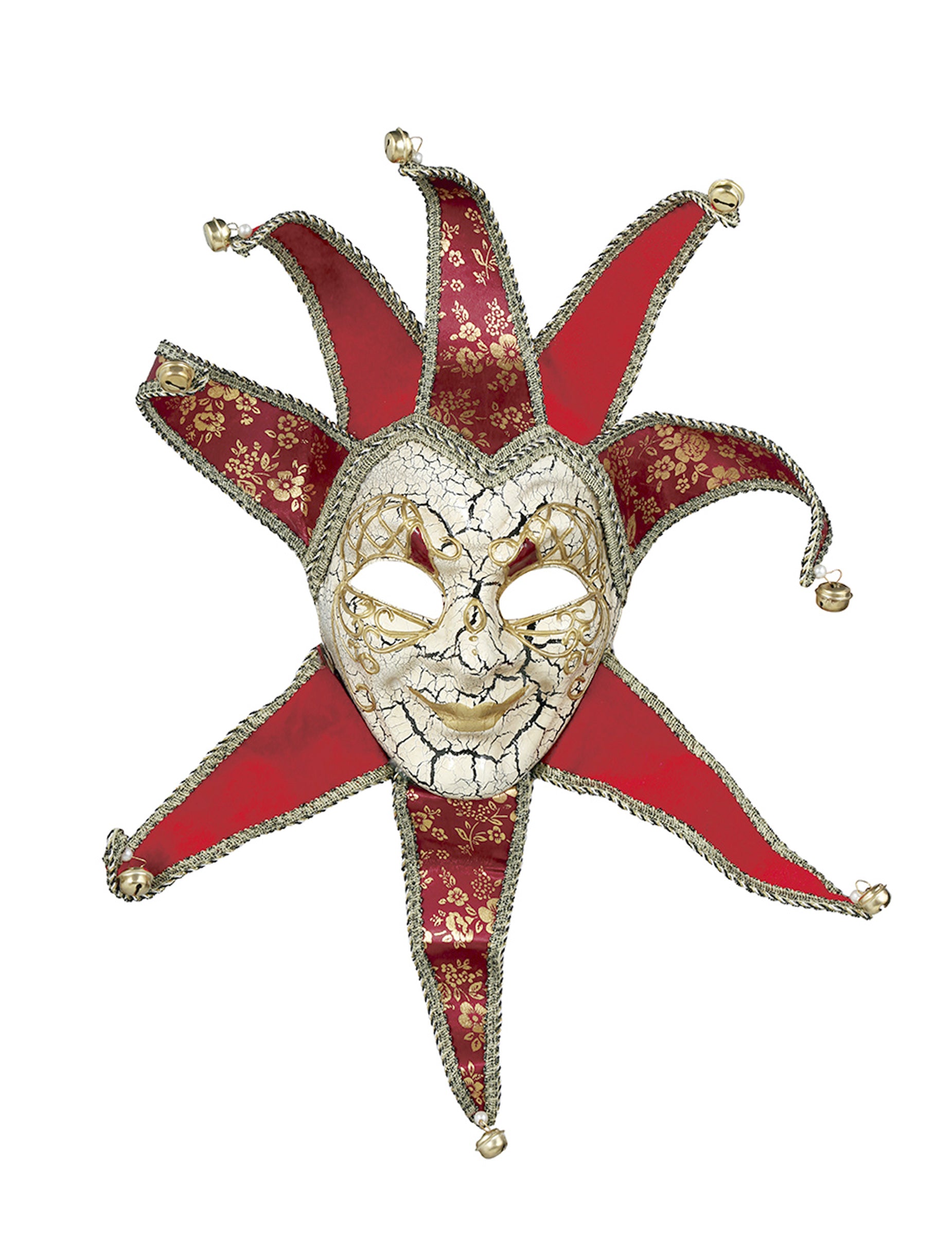 Tato červená a zlatá benátská maska pro muže má propracovaný tvar s obličejem zdobeným popraskaným motivem a zlatými odstíny, které jí dodávají starobylý vzhled.