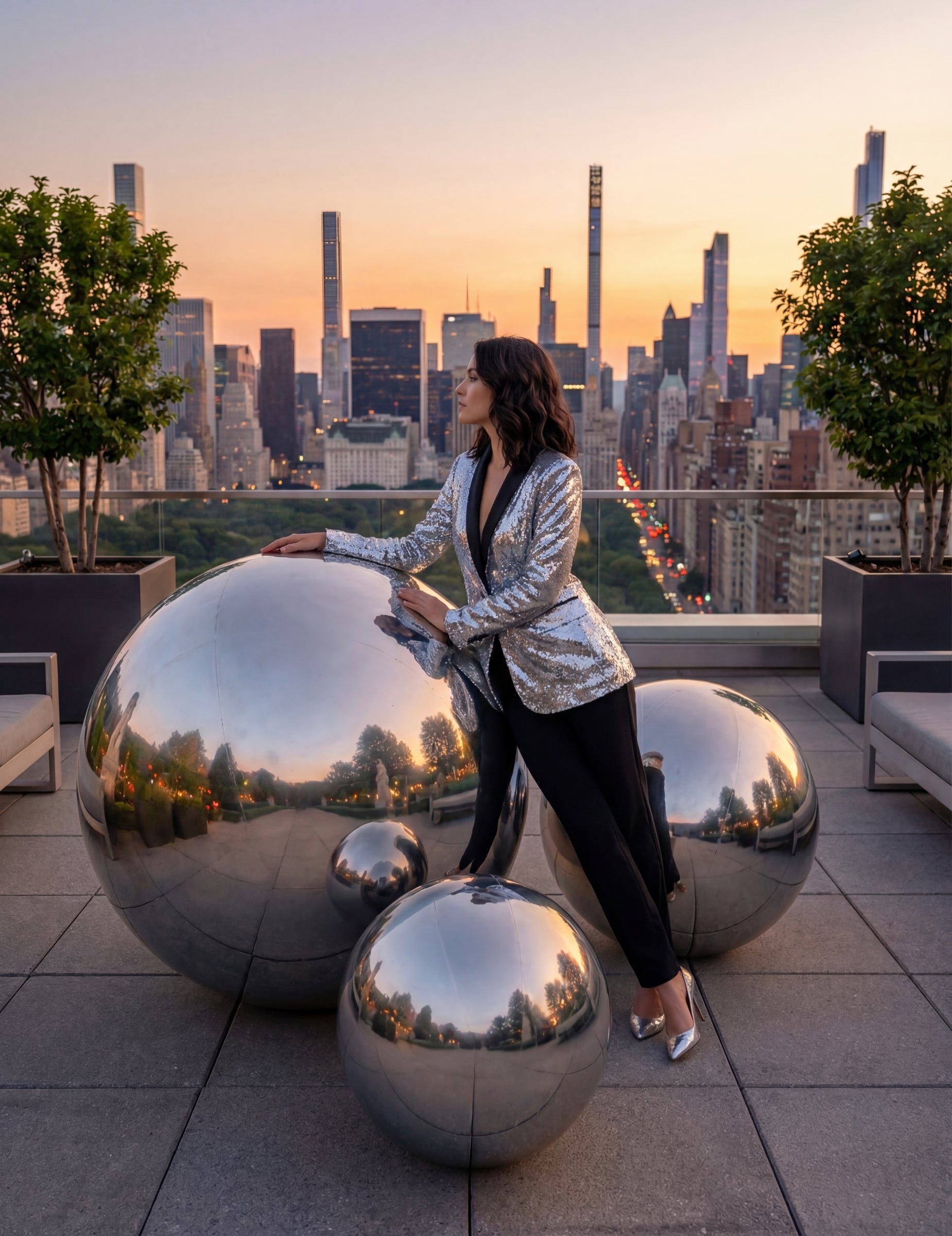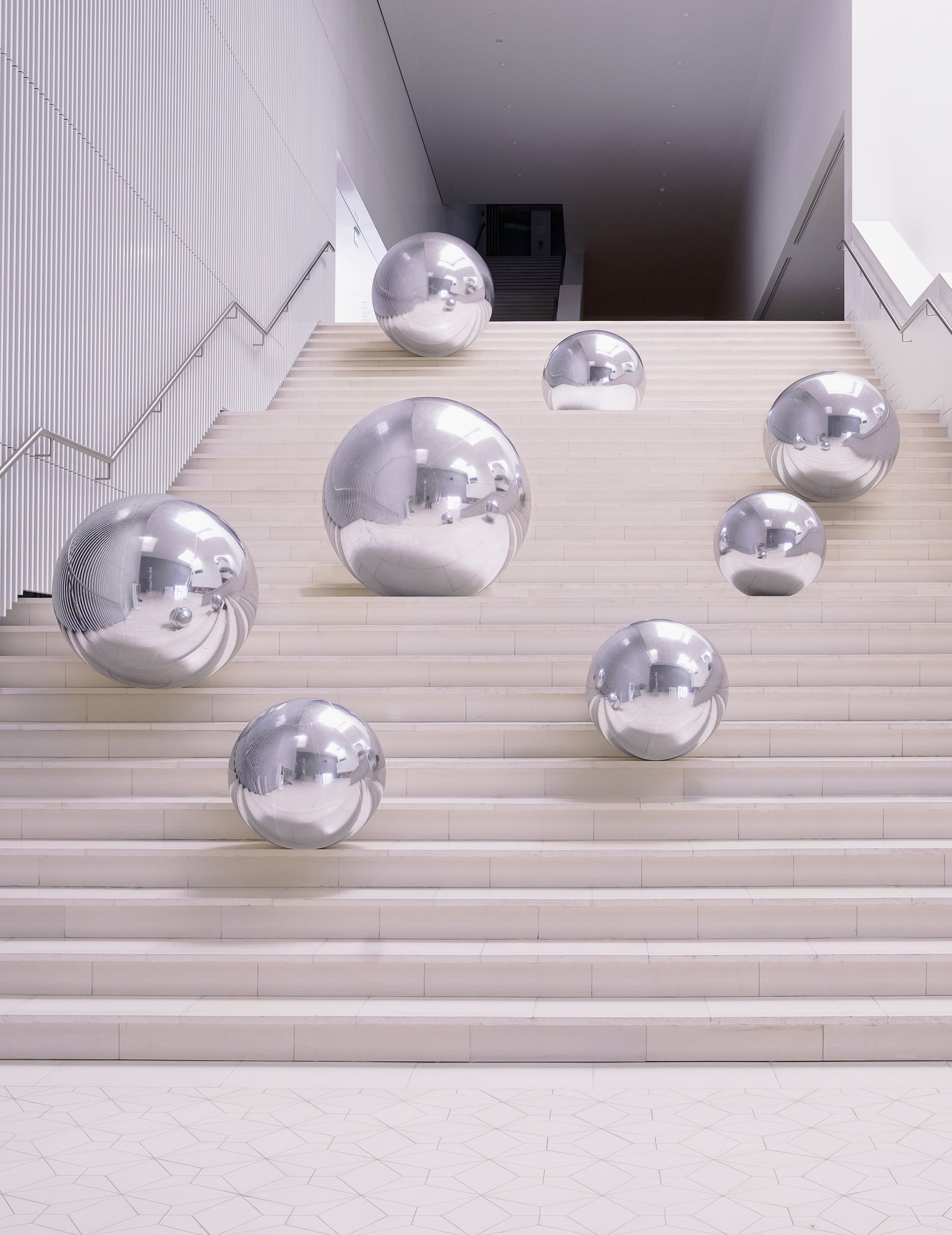 Má stříbrný povrch se zrcadlovým efektem, který odráží světlo a okolní prostředí. Její kulovitý tvar a průměr přibližně 90 cm umožňují snadné začlenění do sálu, recepčního prostoru nebo fotokoutku.