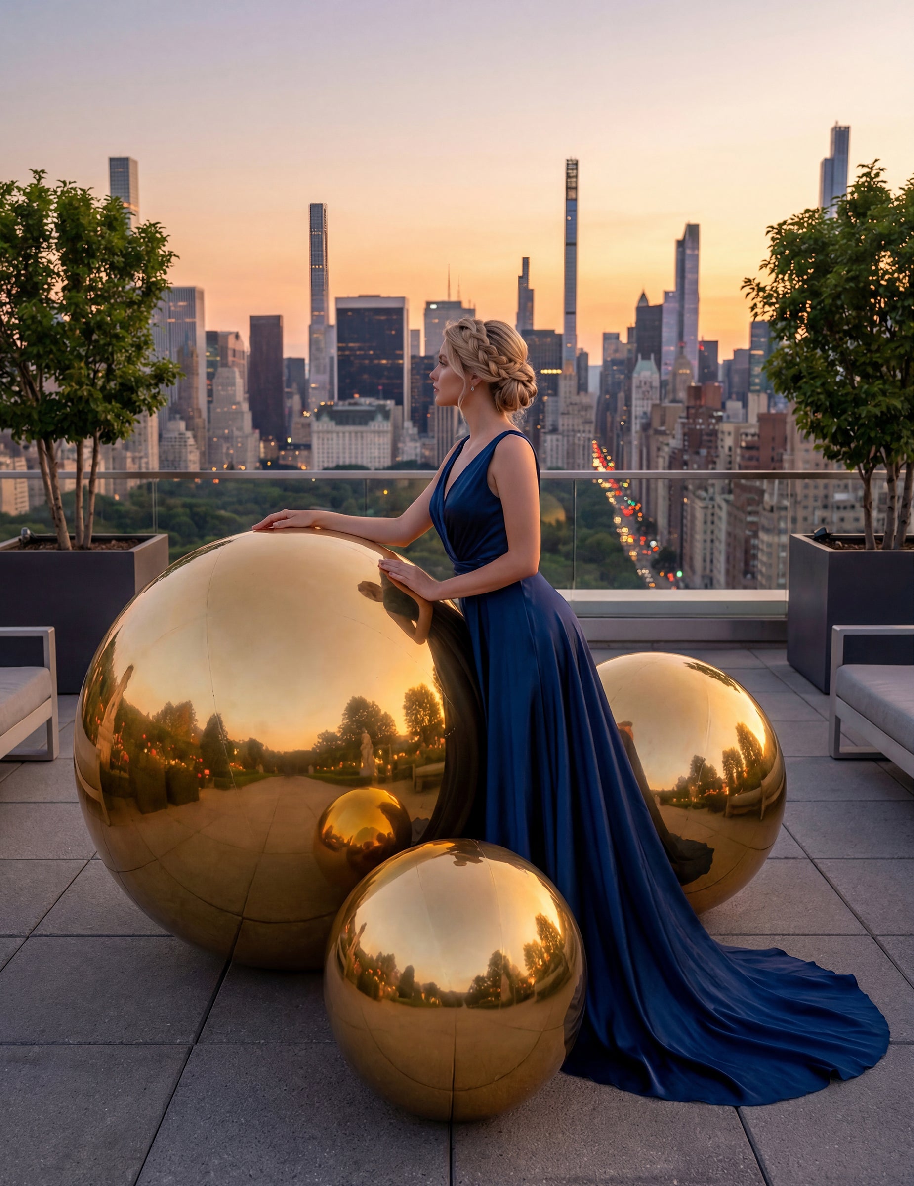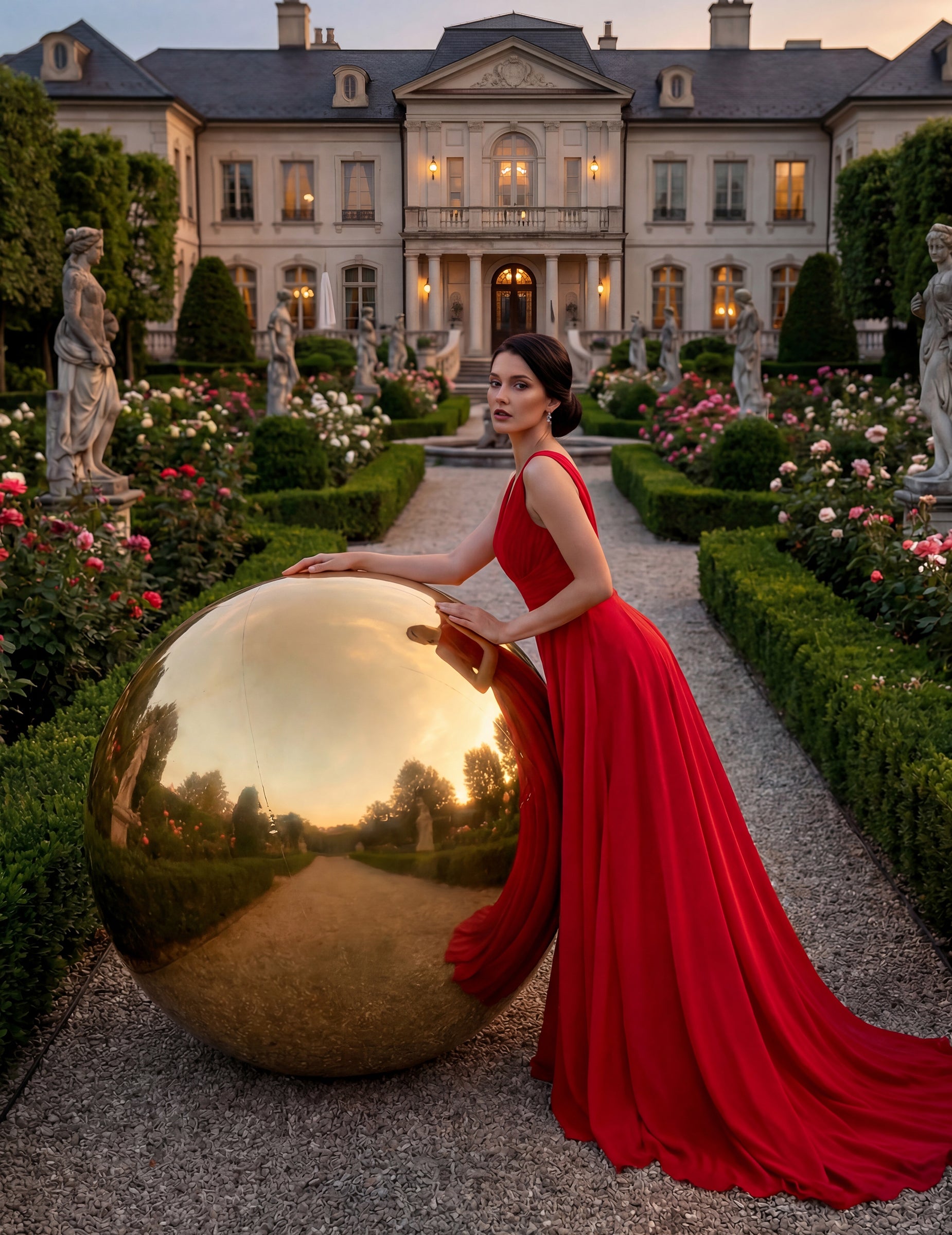 Má zlatý zrcadlový povrch, který odráží světlo a okolní prostředí. Její kulovitý tvar a velký rozměr přibližně 120 cm z ní činí výrazný dekorační prvek vhodný do sálů, zahrad nebo na fotokoutky během oslav.