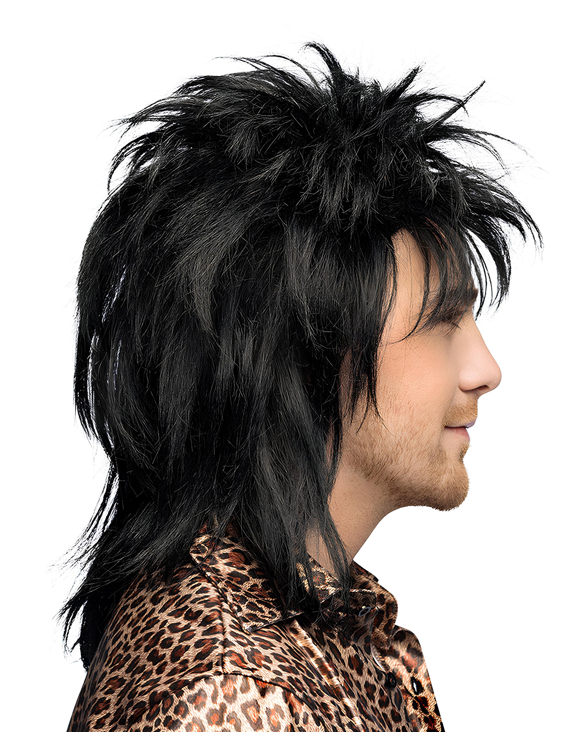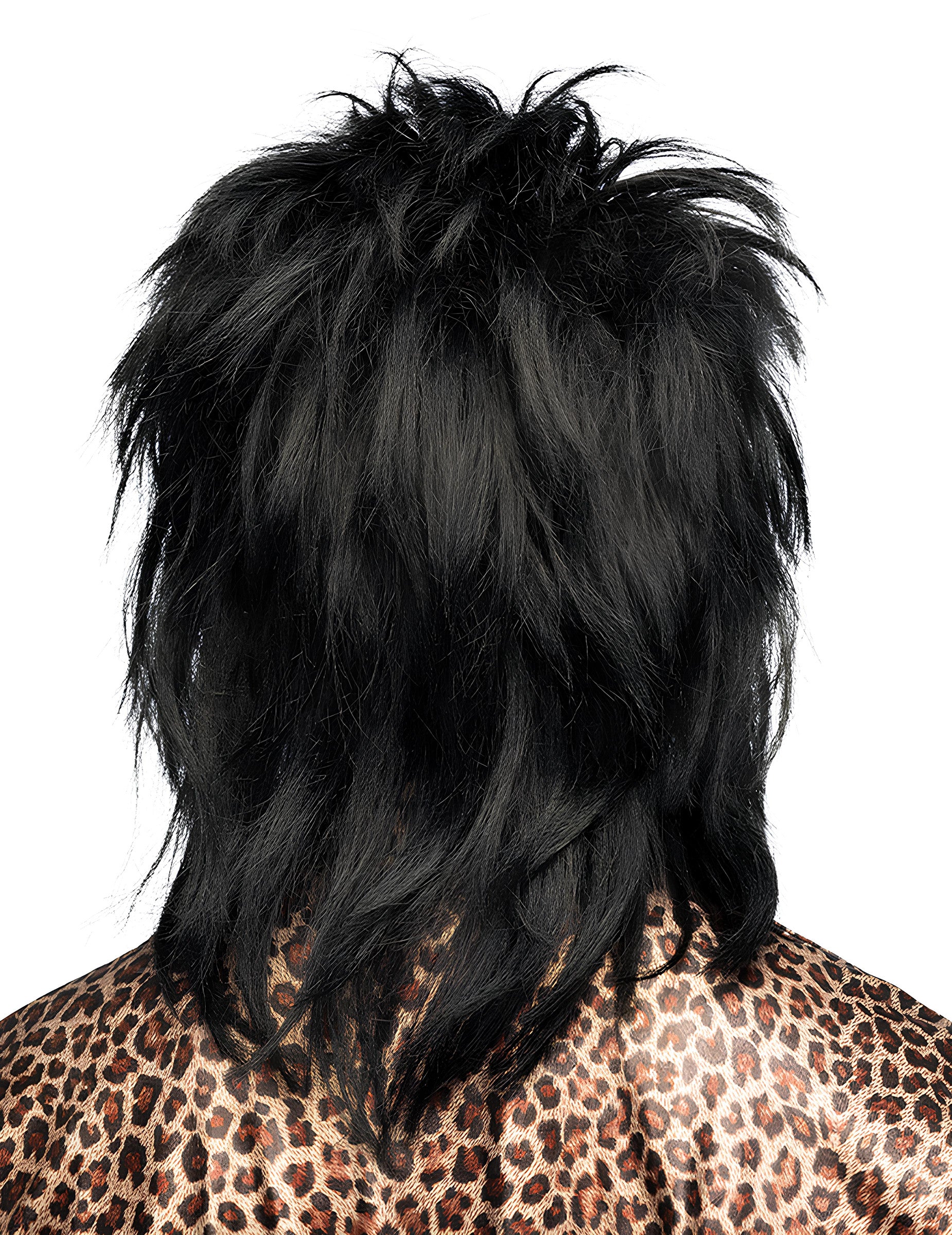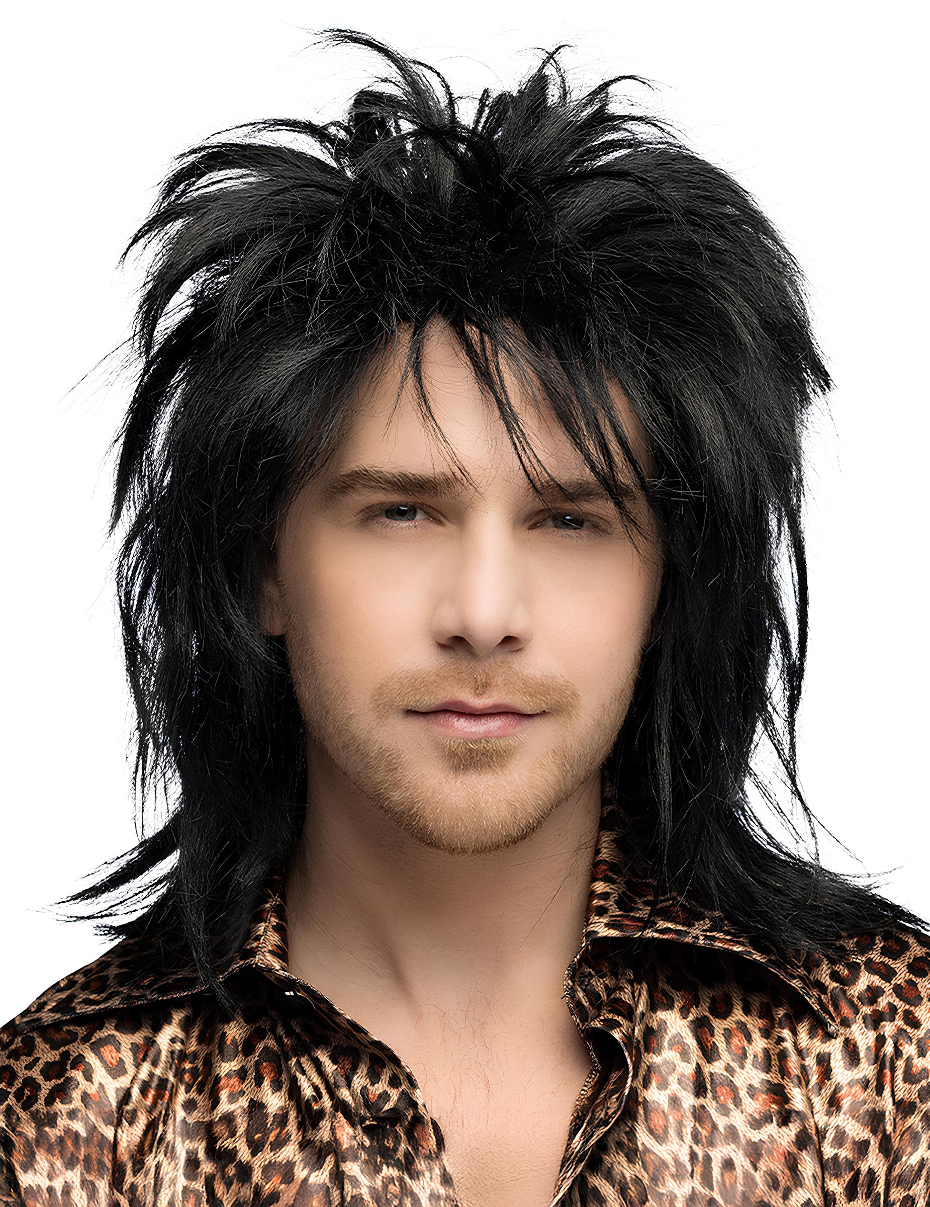 Toto Hardrockerská paruka z 80 zobrazuje objemné černé vlasy, navržené tak, aby dotvářely emblematický rockový převlek této éry. Má dlouhý střih s charakteristickým efektem rozevlátého stylu.