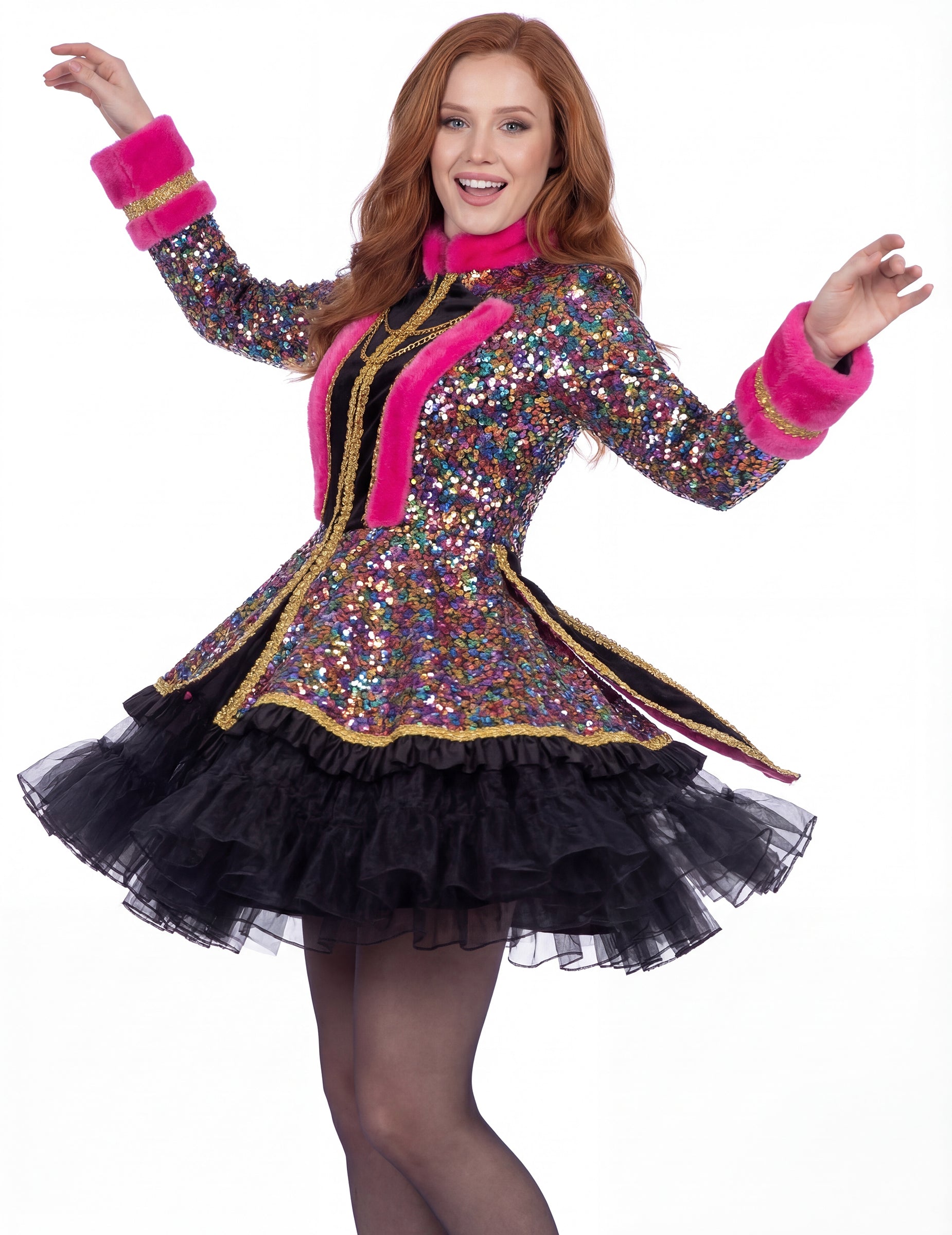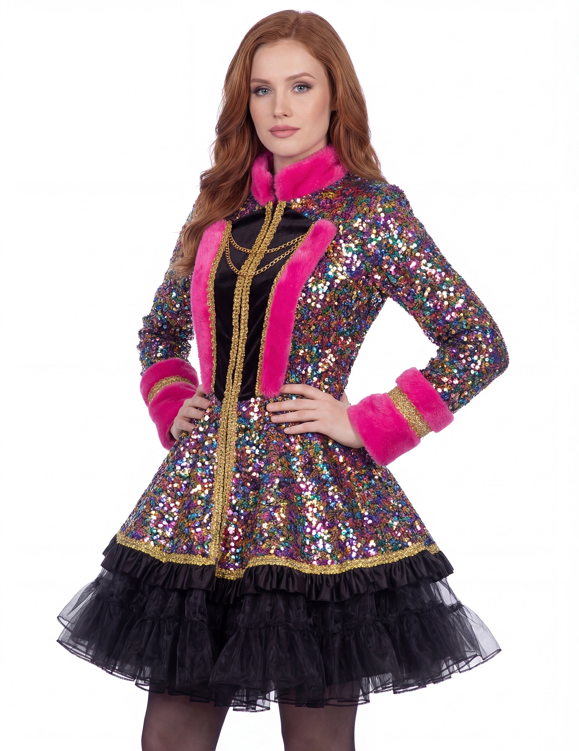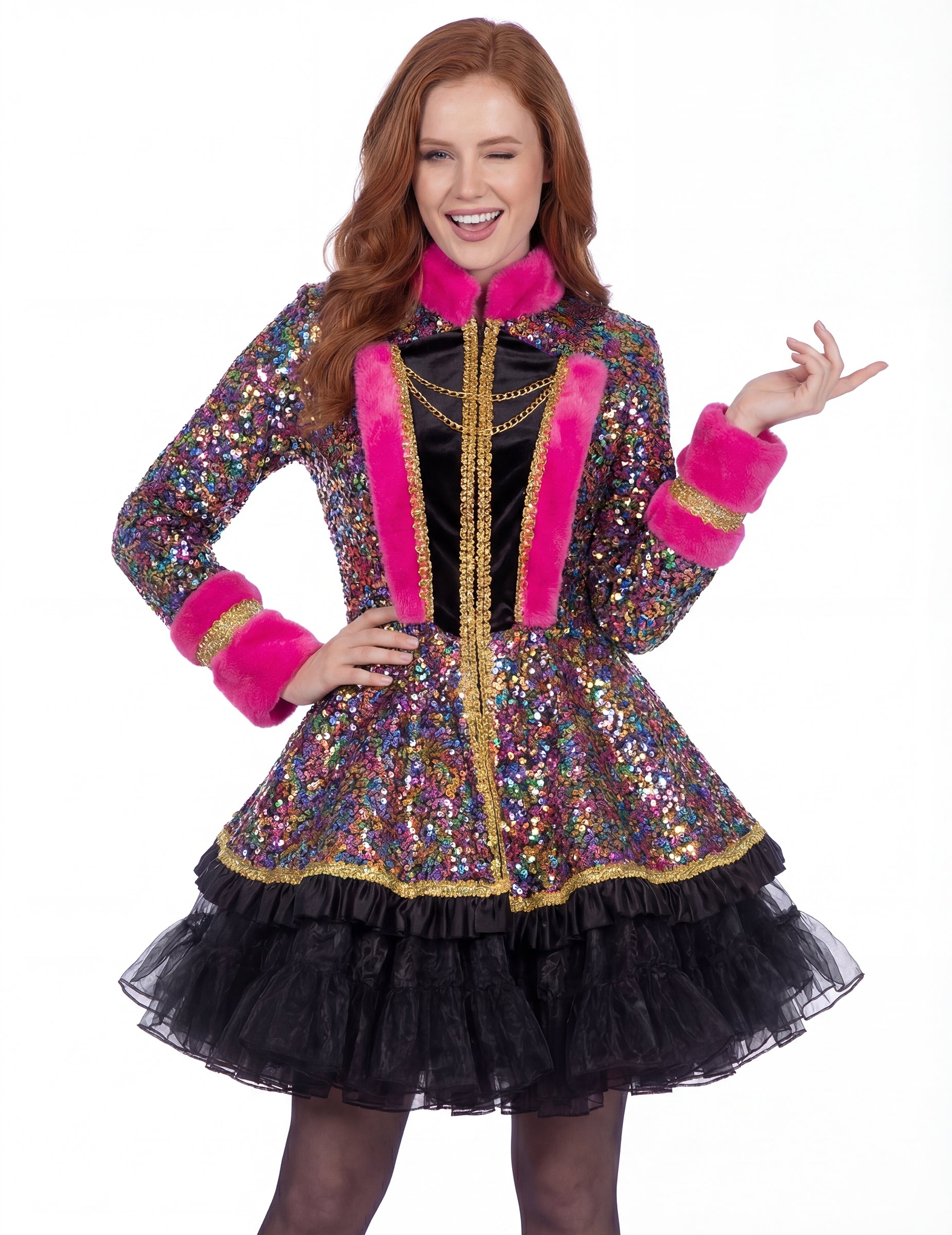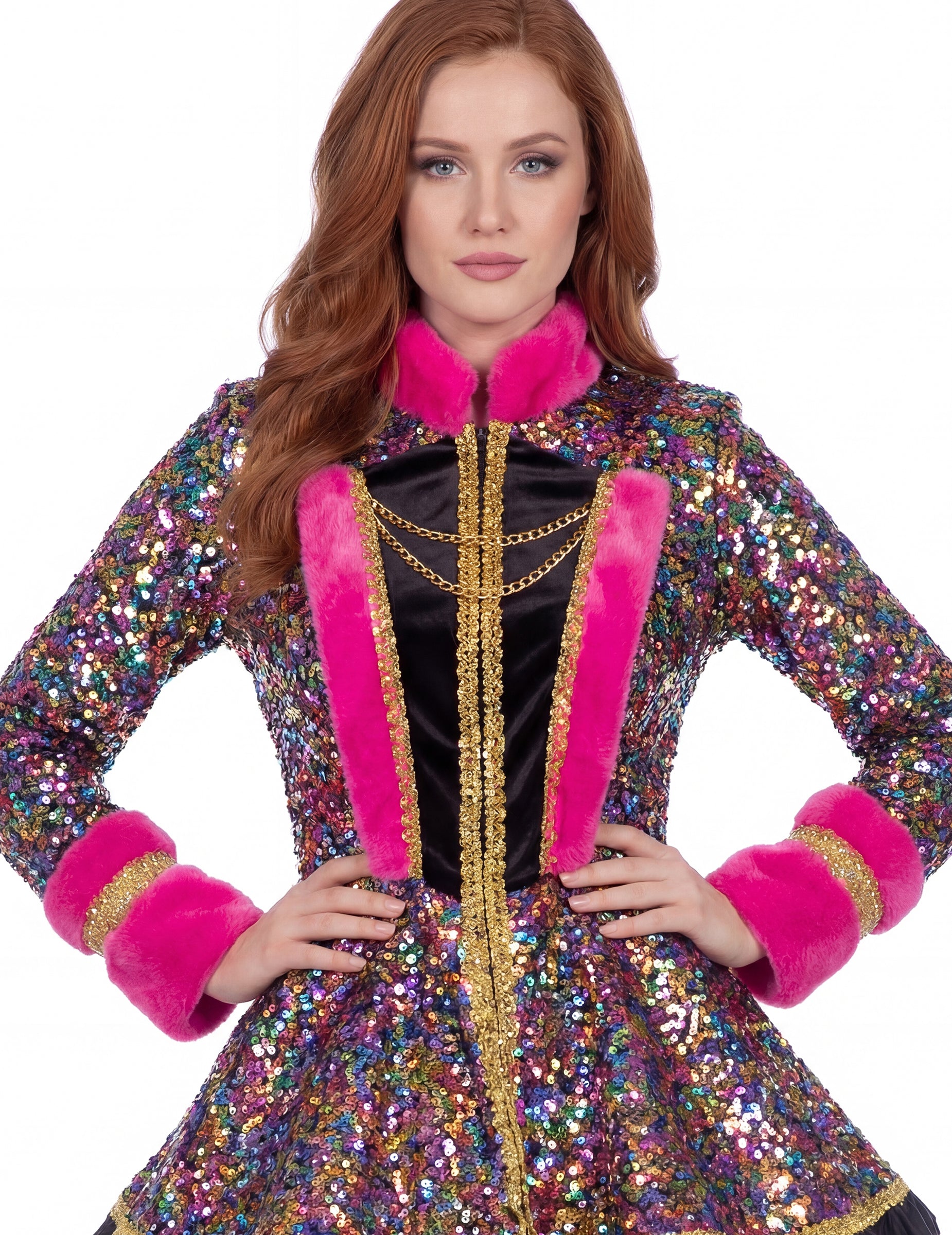 The dámská luxusní vícebarevná flitrová bunda umožňuje vytvořit osobitý outfit na slavnostní událost, kostýmní ples nebo šik tematický večer.