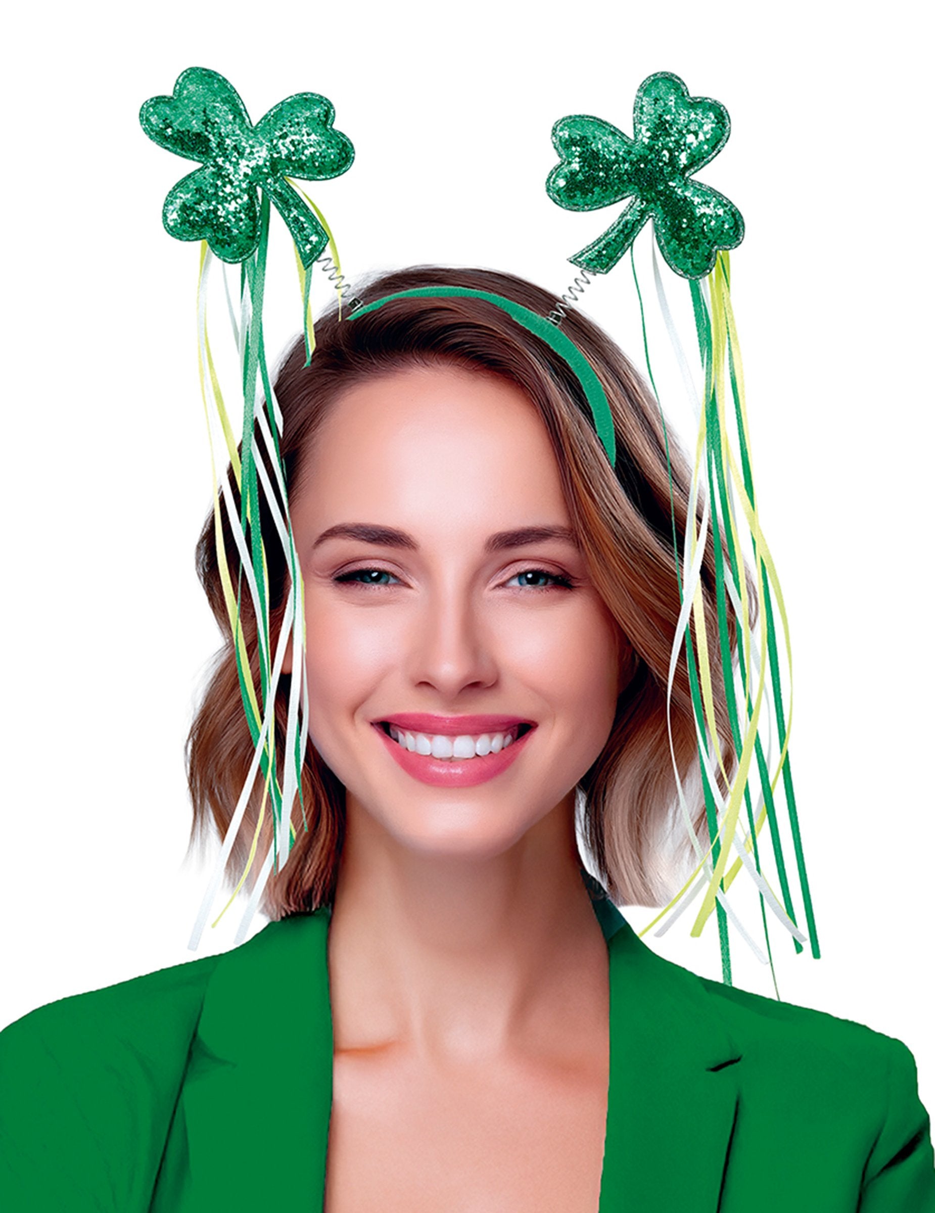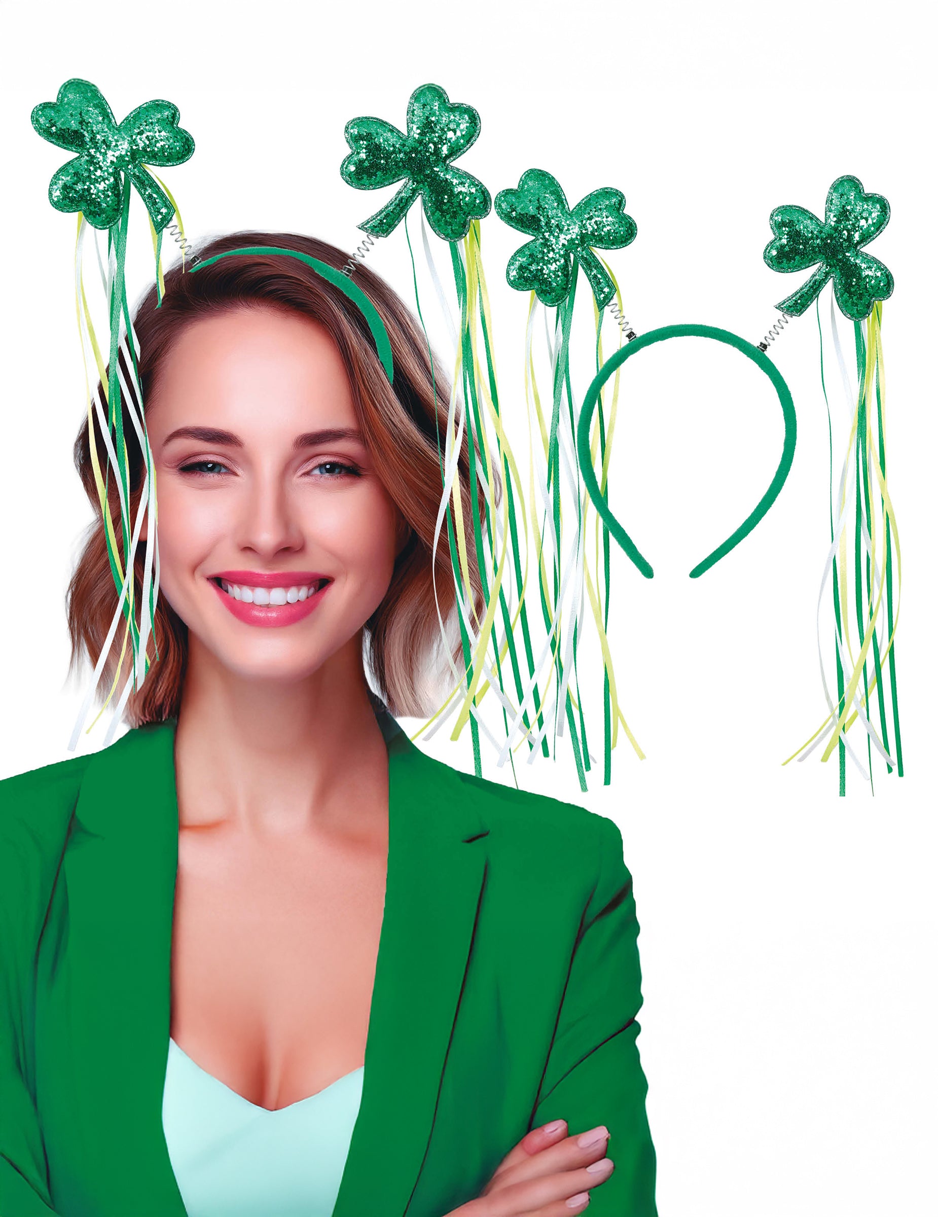 Čelenka se skládá ze zeleného obruče zakončeného jiskřivými zelenými jetele nasazenými na pružných stoncích, doprovázených zelenými a žlutými stuhami padajícími na každé straně. Tvary trojlístku a ozdobné stuhy vytvářejí viditelný pohyb a připomínají tradiční symboly spojené s Dnem svatého Patrika.